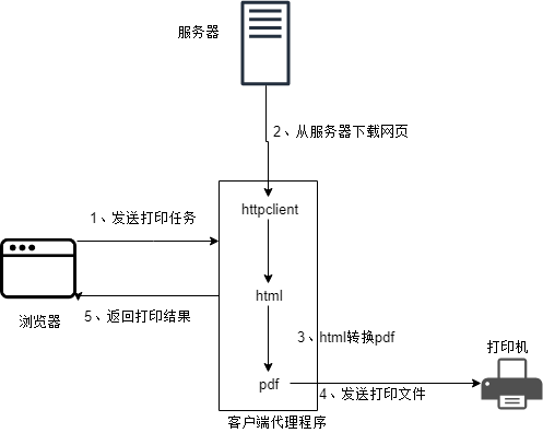 (2)、第二种和第一种其实差不多,需要在客户电脑上启动一个客户端,这个客户端把需要打印的网页一个一个下载下来,转为pdf,再打印。每个网页需要依次进行处理。(至于为什么转换成pdf,网页如果直接发送到打印机中,打出来的就是html标签了,需要渲染之后才能打印出看到的效果)。