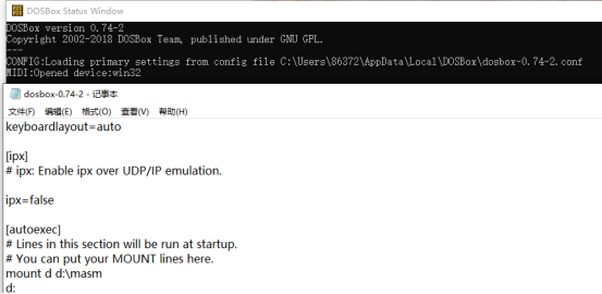 这是显示了本机下的DOS配置文件,在文件末尾写入mount d d:\masm