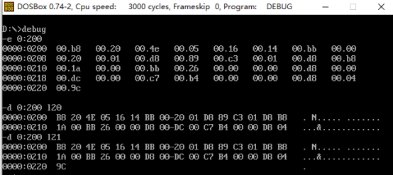 下面利用E命令对该内存范围内的内容进行修改,便再次用D命令查看