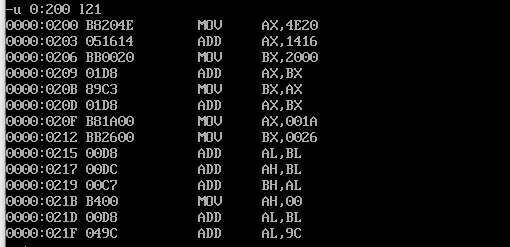 1)e命令修改寄存器的内容,然后用d命令查看0:200-0:220范围内修改的指令