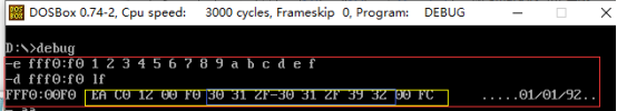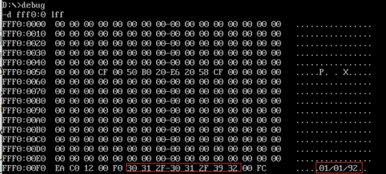 进行以下操作后发现FFF0:F0 FF范围内的内容是无法改变的,而可显示的为01/01/92,所以这便是ROM的生产日期1992年1月1日。