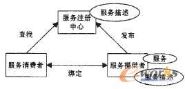 在一个SOA体系有下列三个角色:服务提供者、服务注册中心及服务请求者,分别担任发布、查找和绑定任务。其关系如图1所示。