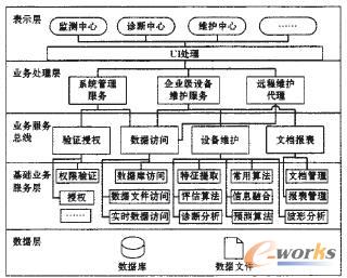 为构建功能可柔性组合的、易于扩展的、互操作性强的企业级应用程序,在图2体系结构的基础上,结合智能维护系统的需要,提出图3所示的基于SOA的智能维护系统架构图。该架构由下而上分别是数据层、基础业务服务层、业务服务总线、业务处理层和表现层,以下是对它们的详细说明。