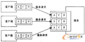 本质上,WCF是完全面向服务的,它是真正的面向服务的编程模型。服务可以根据安全性、传输协议等需要发布为多个端点,每个端点由地址、合同和绑定三要素构成。地址指定了发送消息的目标位置,合同描述消息所包含的内容,绑定描述如何发送消息。客户端通过对这三要素的配置即可实现对服务的访问,而不用关心服务内部是如何实现的,如图5(其中A、C、B分别代表Address、Contract和Binding)所示。因此,利用WCF技术可以很方便的满足智能维护系统远程、分布式的需要。