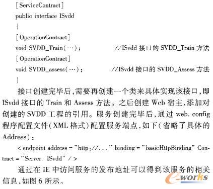 首先在工程中引用System.ServiceModel创建服务接口。该接口定义了退化评估的各个方法,但并不实现。使用[Service.Contract]和[OperationContract]修饰接口和接口中定义的方法,以表明该接口和方法要作为服务的合同发布。如下申明了接口ISvdd及它的两个方法Train和Assess(省略了具体参数)。