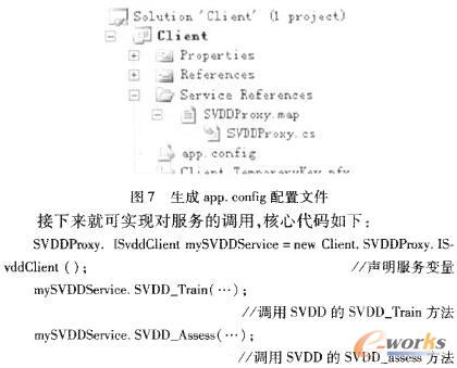 客户端按SVDD服务的发布地址添加对SVDD的服务引用,命名为SVDDProxy,此时在客户端会自动从服务器端获取服务的端点信息,并生成一个app.config配置文件(如图7所示)。