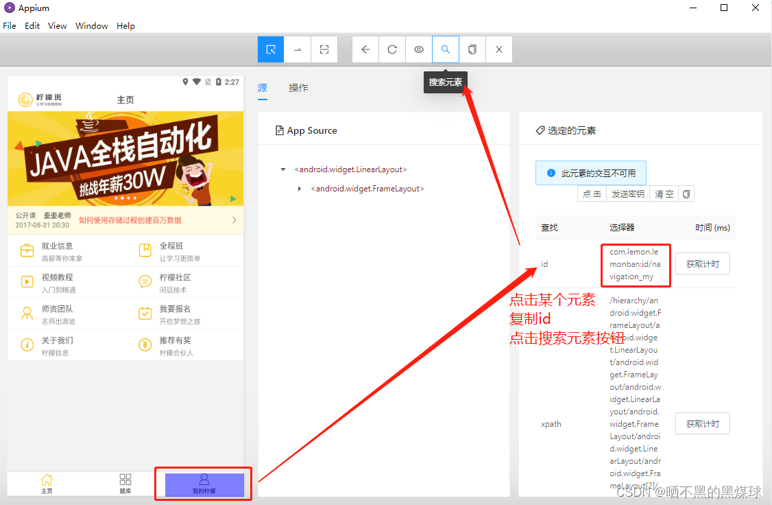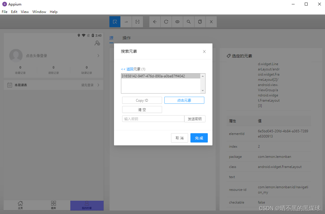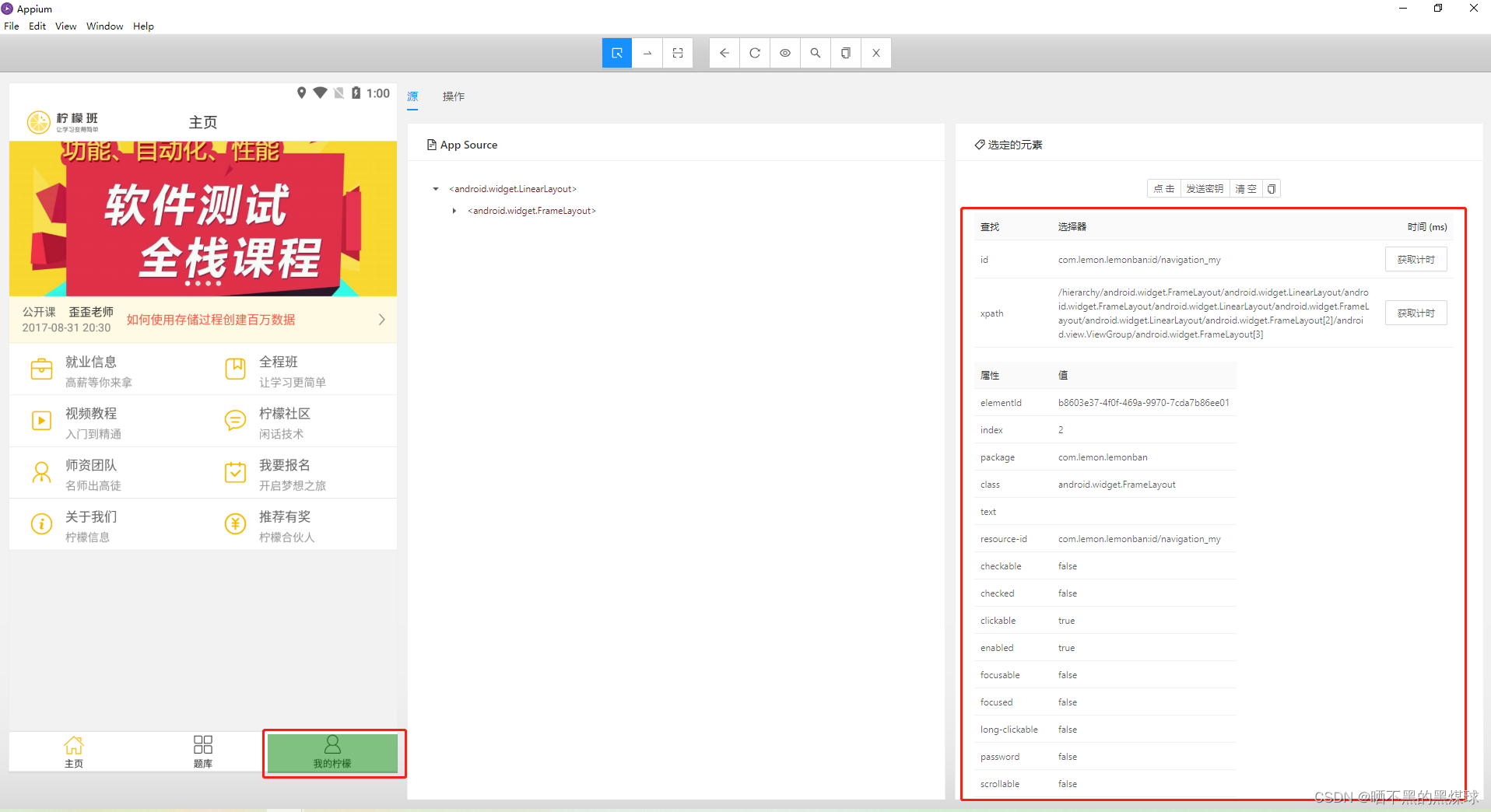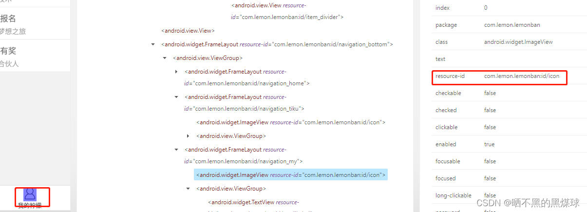 resource-id:com.lemon.lemonban:id/navigation_my(一般来说,元素中都会有resource-id,但在app当中不一定是唯一的,可以重复的)