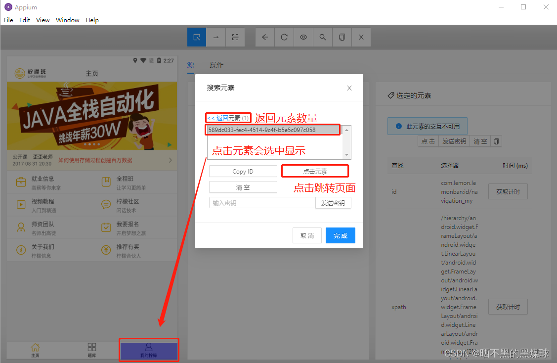 选中返回的元素,点击【点击元素】按钮,可以操作跳转到对应页面