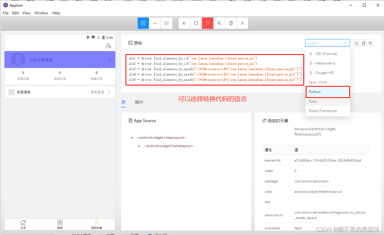 appium inspect 中还有录制功能,也没太大作用,比较鸡肋,可以转换成python语言,来提示如何编写元素定位