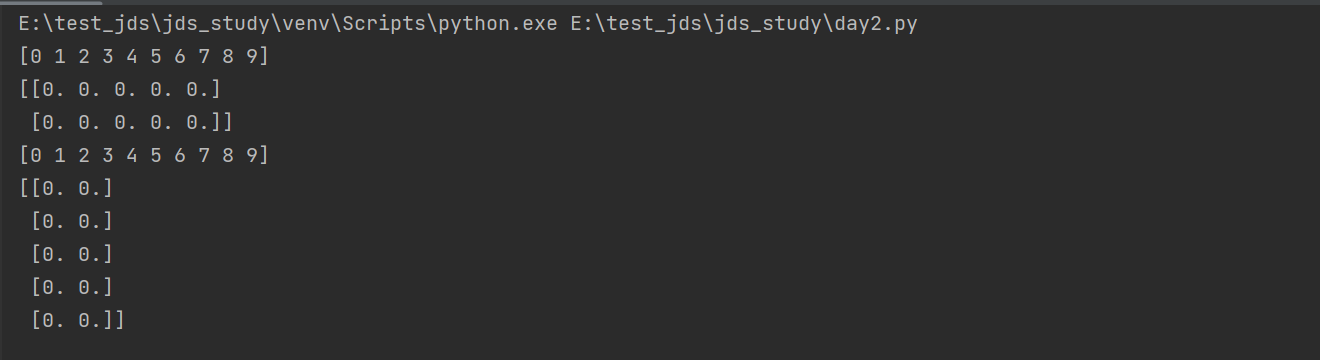 ar1=np.arange(10) ar2=np.zeros((2,5)) print(ar1) print(ar2) print(ar1.T) print(ar2.reshape(5,2))
