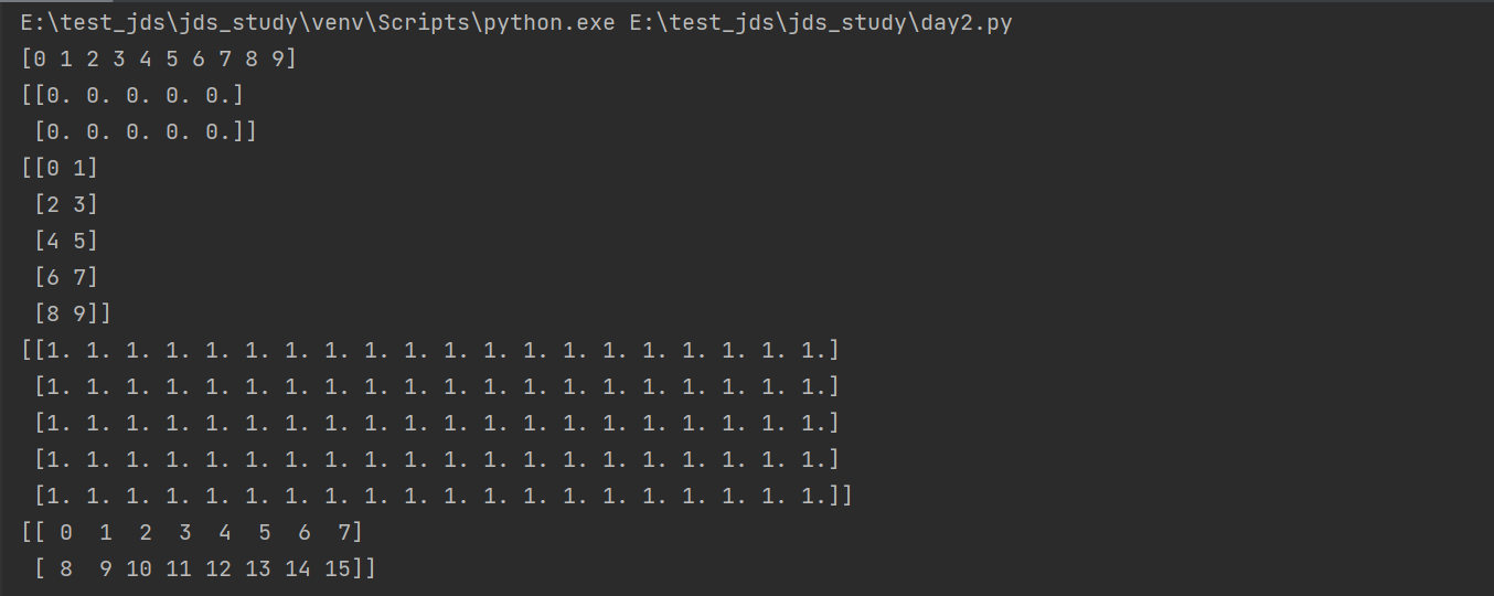ar1=np.arange(10) ar2=np.zeros((2,5)) print(ar1) print(ar2) print(ar1.reshape(5,2)) print(np.ones((10,10)).reshape(5,20)) print(np.reshape(np.arange(16),(2,8)))