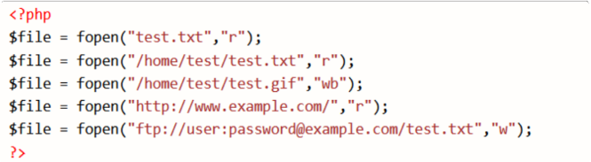 如果 PHP 认为 *filename* 指定的是⼀个本地⽂件,将尝试在该⽂件上打开⼀个流。该⽂件必须是 PHP 可以访问的,因此需要确认⽂件访问权限允许该访问。如果激活了安全模式或者 open_basedir 则会应⽤进⼀步的限制。