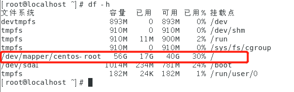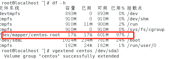 7.lvextend -L+39G /dev/mapper/centos-root /dev/sda3扩展磁盘空间