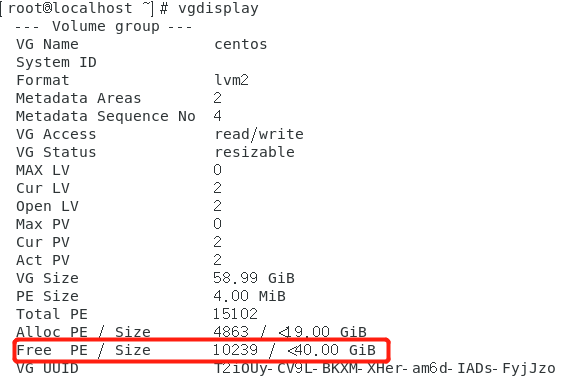 6.vgdisplay 擦好看扩展空间的大小Free PE/Size为可提供分配的自由空间,扩展时要输入时必须小于该值