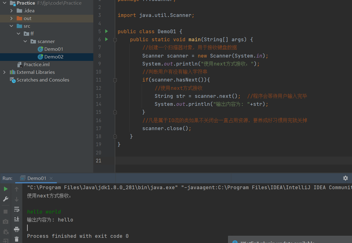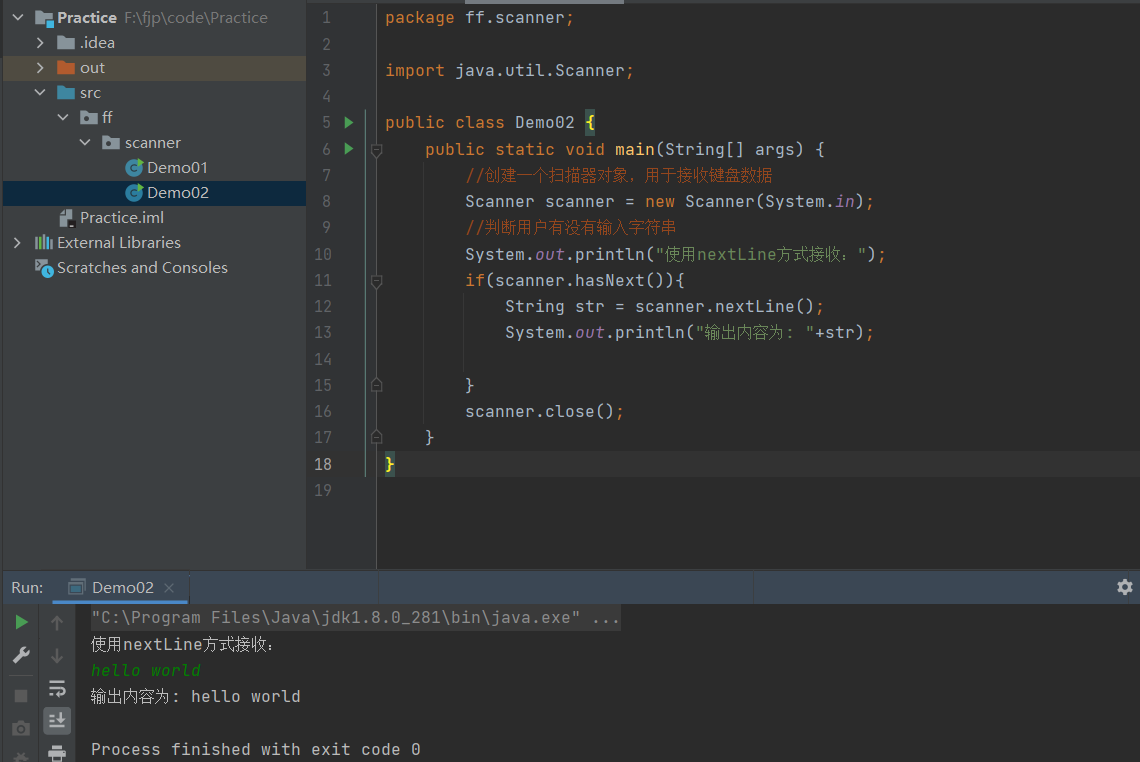 通过Scanner类的next()和nextLine()方法获取输入的字符串,在读取前我们一般需要使用hasNext()与hasNextLine()判断是否还有输入的数据。