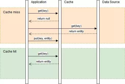 •首先,应用程序先确定数据是否保留在缓存中;•如果数据在缓存中,也即 Cache hit ,称作“缓存命中”。数据直接从缓存中读取并返回给客户端应用程序;•如果数据不在缓存中,也即 Cache miss,称作“缓存未命中”。应用程序会从数据存储的地方,如 MySQL 数据源中读取该数据,并将数据存储在缓存中,然后将其返回给客户端。