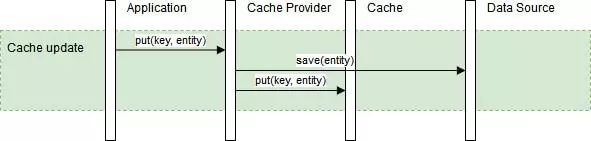 Write-Through 策略下,当发生数据更新(Write)时,缓存提供程序 Cache Provider 负责更新底层数据源和缓存。缓存与数据源保持一致,并且写入时始终通过抽象缓存层到达数据源。