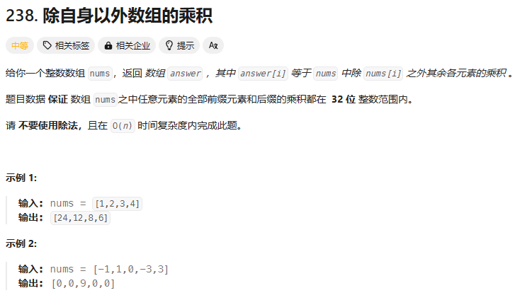 https://leetcode.cn/problems/product-of-array-except-self/description/?envType=study-plan-v2&envId=top-100-liked