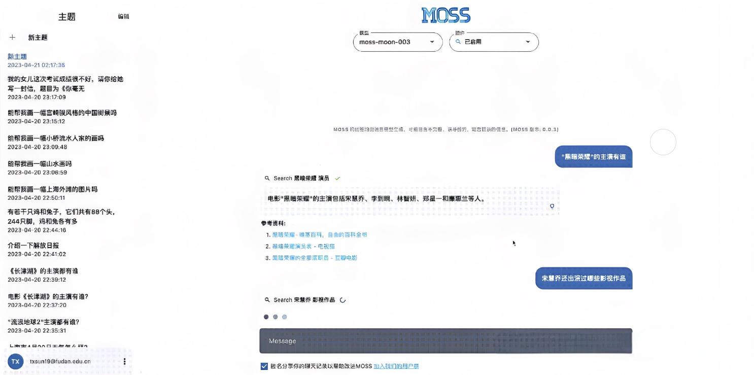 MOSS是一个支持中英双语和多种插件的开源对话语言模型,moss-moon系列模型具有160亿参数,在FP16精度下可在单张A100/A800或两张3090显卡运行,在INT4/8精度下可在单张3090显卡运行。MOSS基座语言模型在约七千亿中英文以及代码单词上预训练得到,后续经过对话指令微调、插件增强学习和人类偏好训练具备多轮对话能力及使用多种插件的能力。