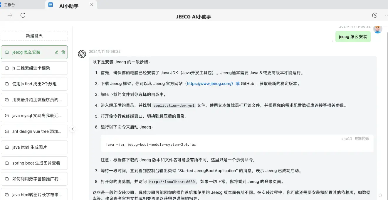- AI能力:目前JeecgBoot支持AI大模型chatgpt和deepseek,现在最新版默认使用deepseek,速度更快质量更高。目前提供了AI对话助手、AI建表、AI报表等功能。