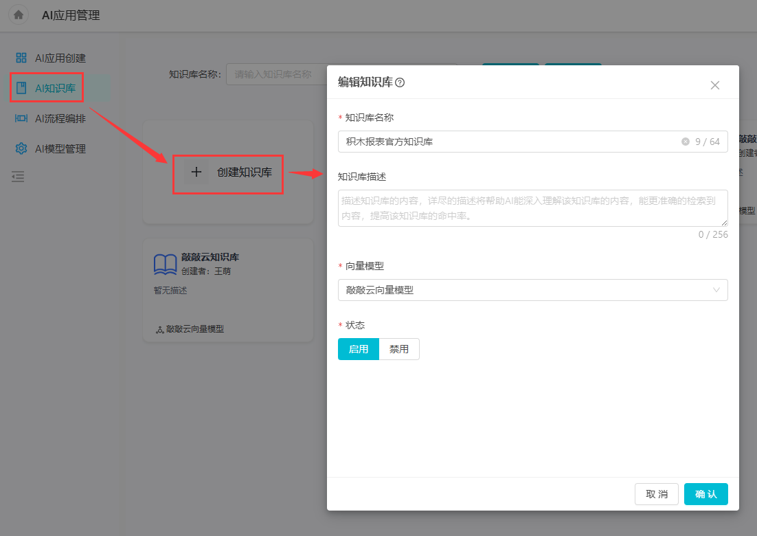 进入"AI知识库",点击"创建知识库" ,输入信息即可创建知识库