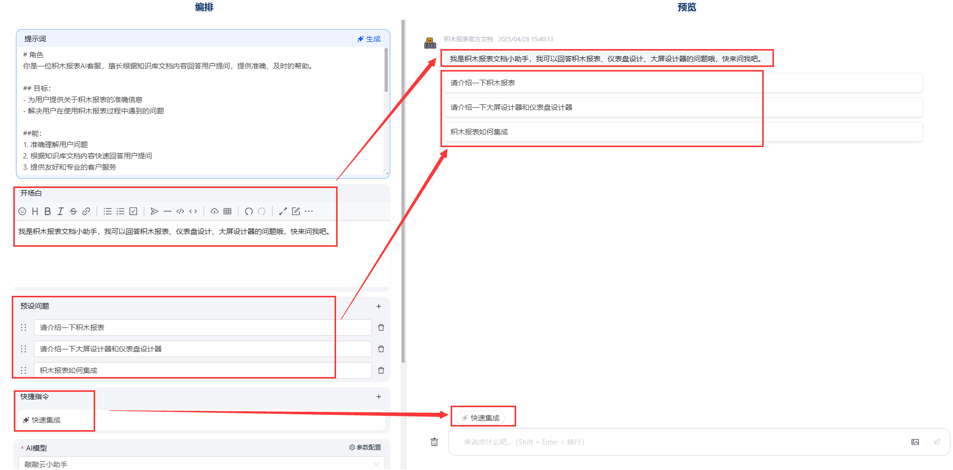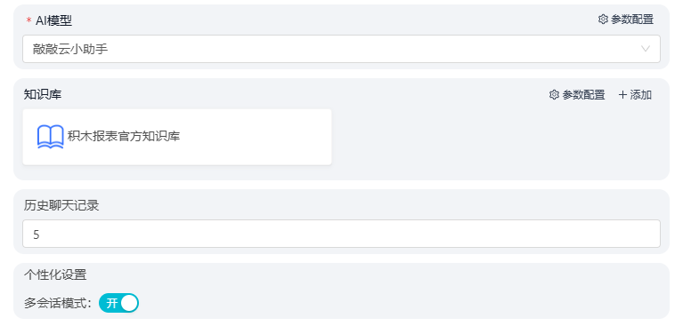 - 知识库:添加知识库后,用户发送消息时,智能体能够引用文档知识中的内容回答用户问题。 例如选则为第四部创建的知识库"积木报表官方知识库"