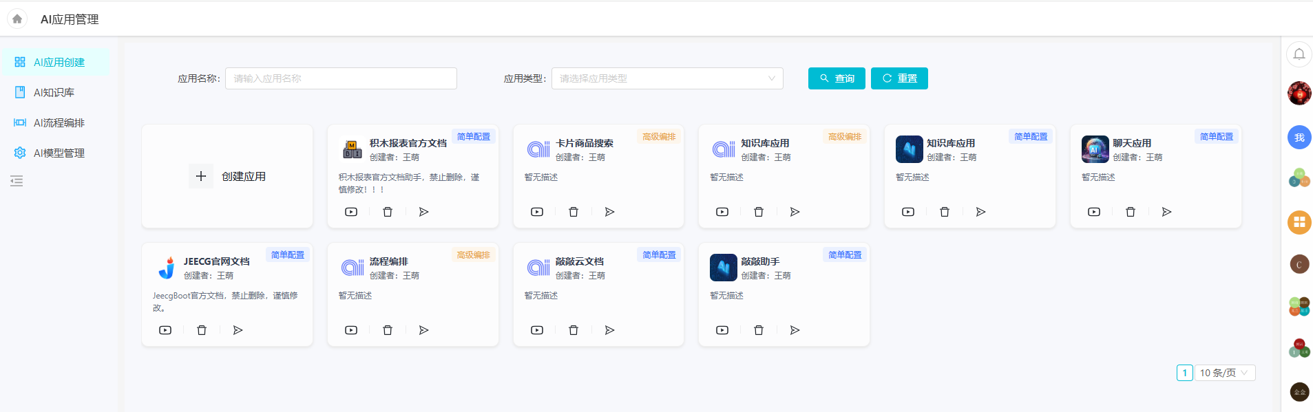 登录进入敲敲云后,点击"AI应用"进入AI功能管理界面,咱们会用到"AI模型管理"、"AI知识库"、"AI应用管理"这三大模块。