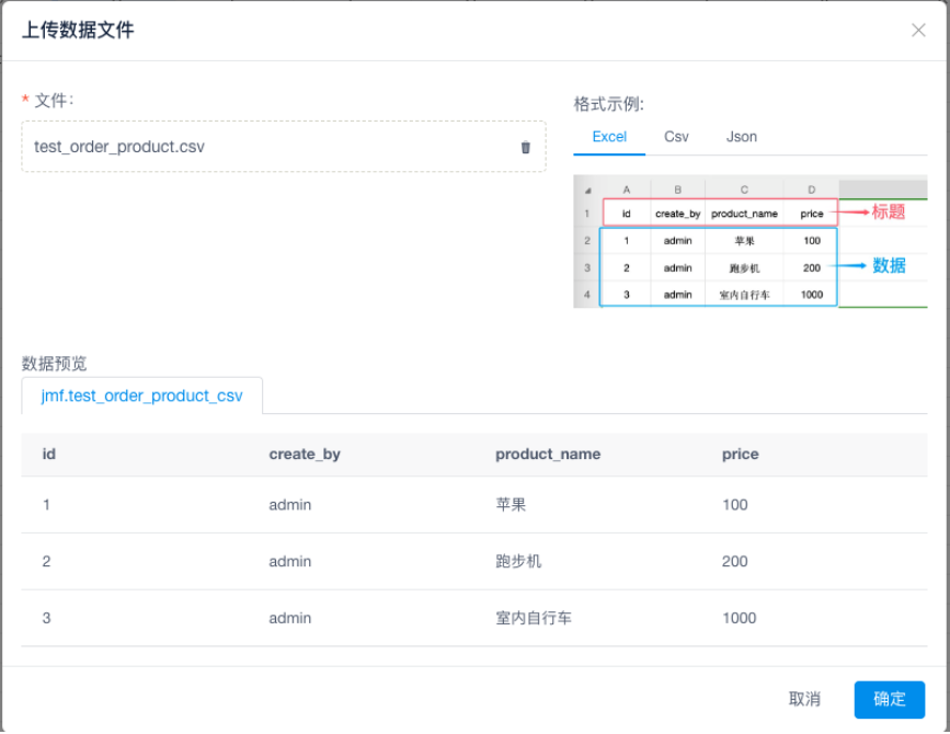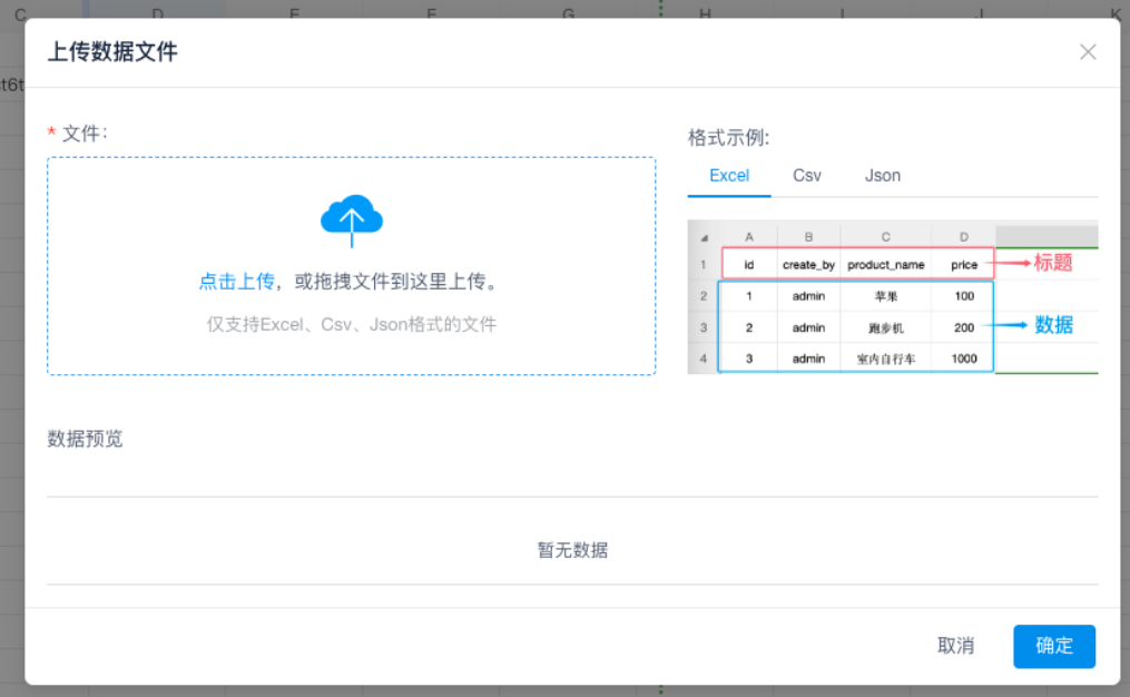 - 第一行是标题行,第二行开始是数据,数据与标题要对应。