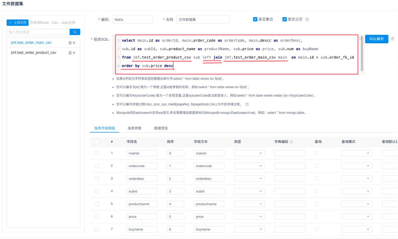 多文件数据集支持上传多个文件,并且使用sql语句对数据进行自定义的查询,支持分页、关联、分组、排序等。