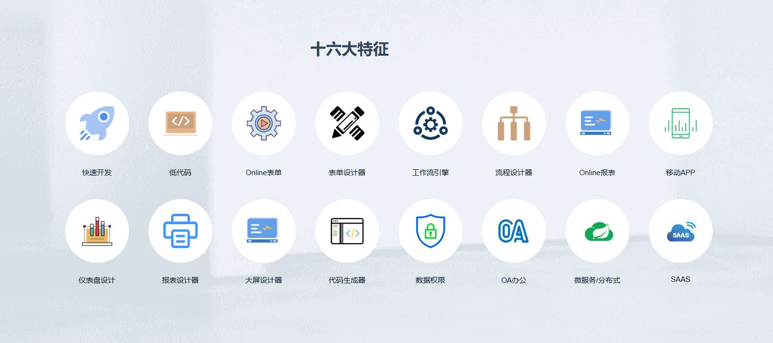 JeecgBoot 提供了一系列低代码能力,实现真正的零代码在线开发:Online表单开发、Online报表、复杂报表设计、打印设计、在线图表设计、仪表盘设计、大屏设计、移动图表能力、表单设计器、在线设计流程、流程自动化配置、插件能力(可插拔)。