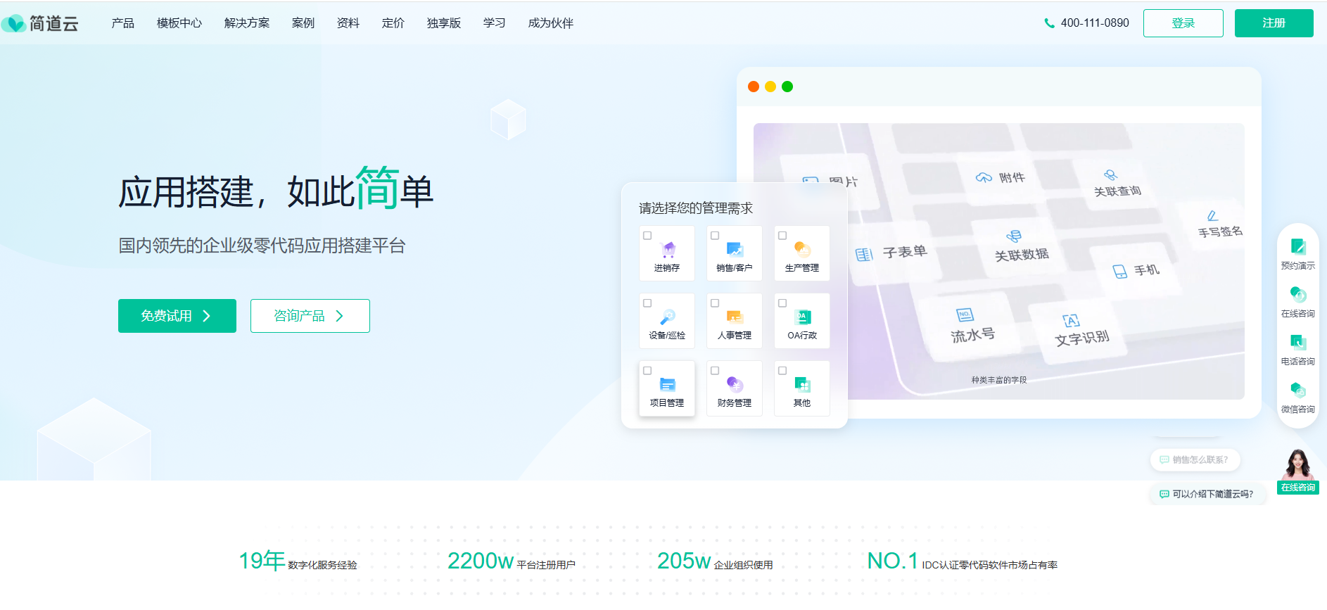 简道云帮助各行业人员快速搭建个性化的CRM,ERP,供应链等系统.包含表单,流程,自定义报表,外部互联等功能。