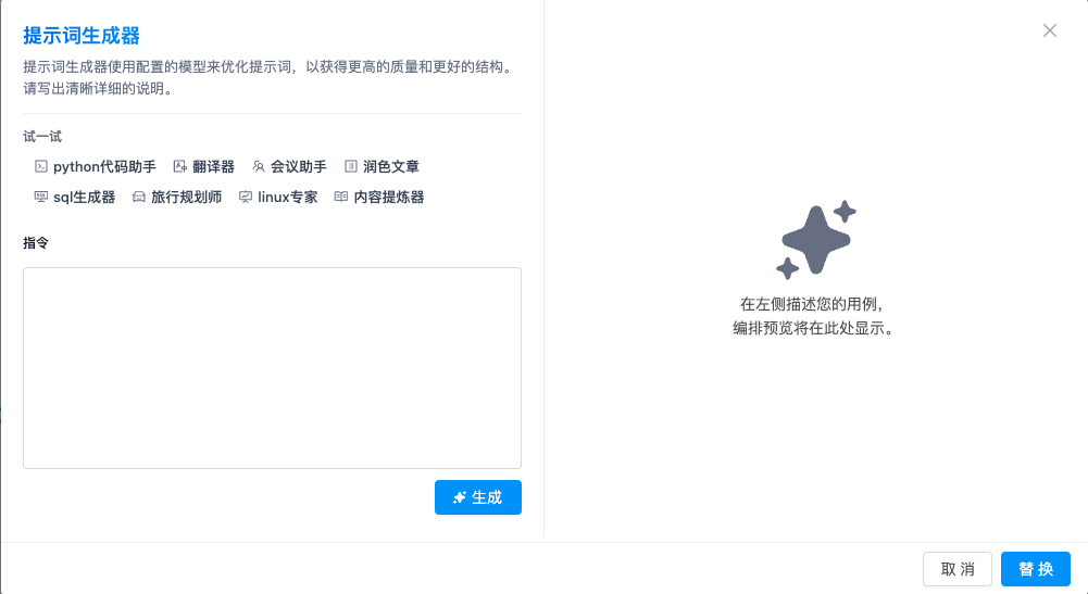 如果您不确定如何编写提示词,可以通过点击生成按钮来进入提示词生成器。在该界面中,您可以填写您的需求,AI将会自动帮助您生成合适的提示词。这种方式可以有效地帮助您获取所需的内容,节省时间和精力。请确保尽量详细地描述您的需求,以便生成器能够提供更准确的提示词。