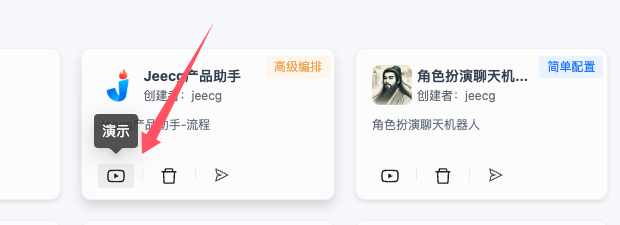 在应用列表 页面,点击应用下方的演示按钮,系统会在新窗口中打开 AI 应用的演示界面。