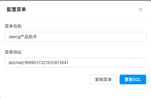 - 配置菜单 :在 JeecgBoot 系统内新增菜单项,使 AI 应用成为系统的一部分。