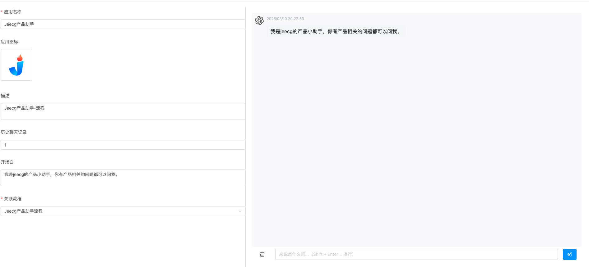 - 关联流程:选择已创建的 AI 工作流,以定义应用的智能行为。