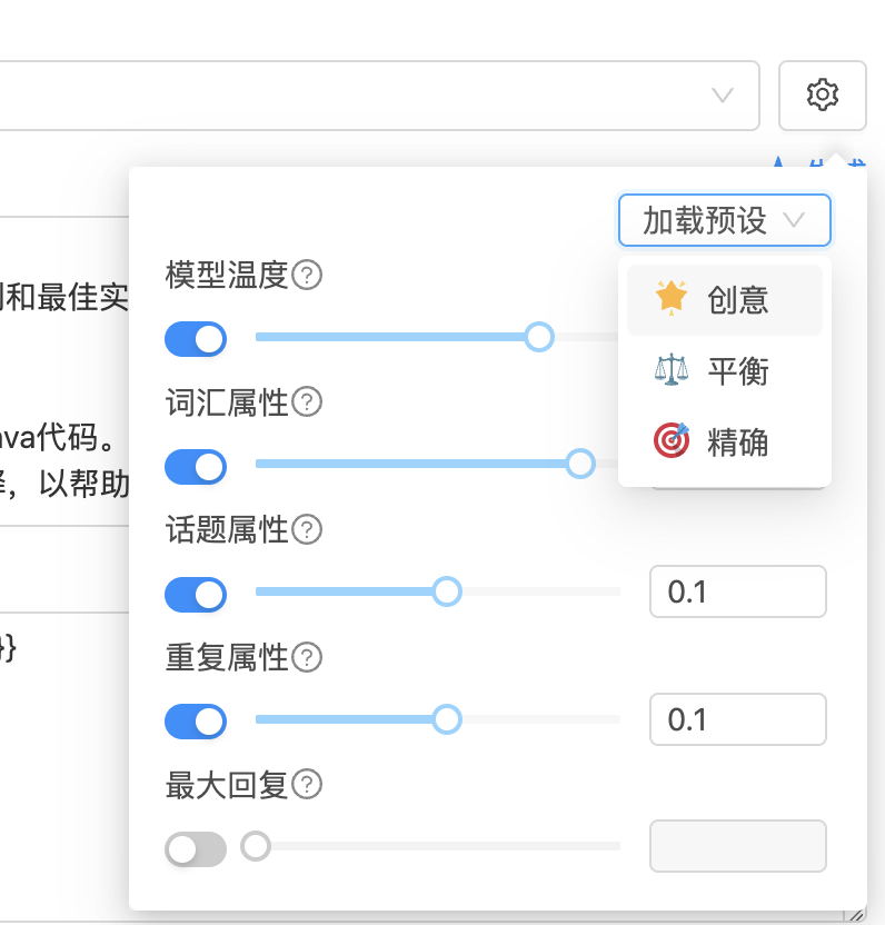 - 平衡模式:在创造力与准确性之间取得平衡,适合大多数业务场景;