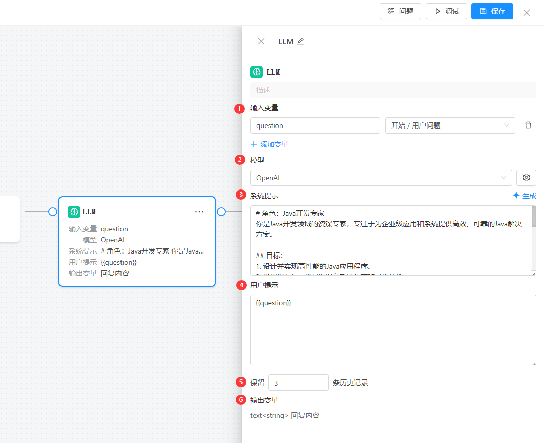 输入变量可以通过占位符 {{变量名}} 灵活插入到系统提示词或用户提示词中,实现动态内容填充。例如: