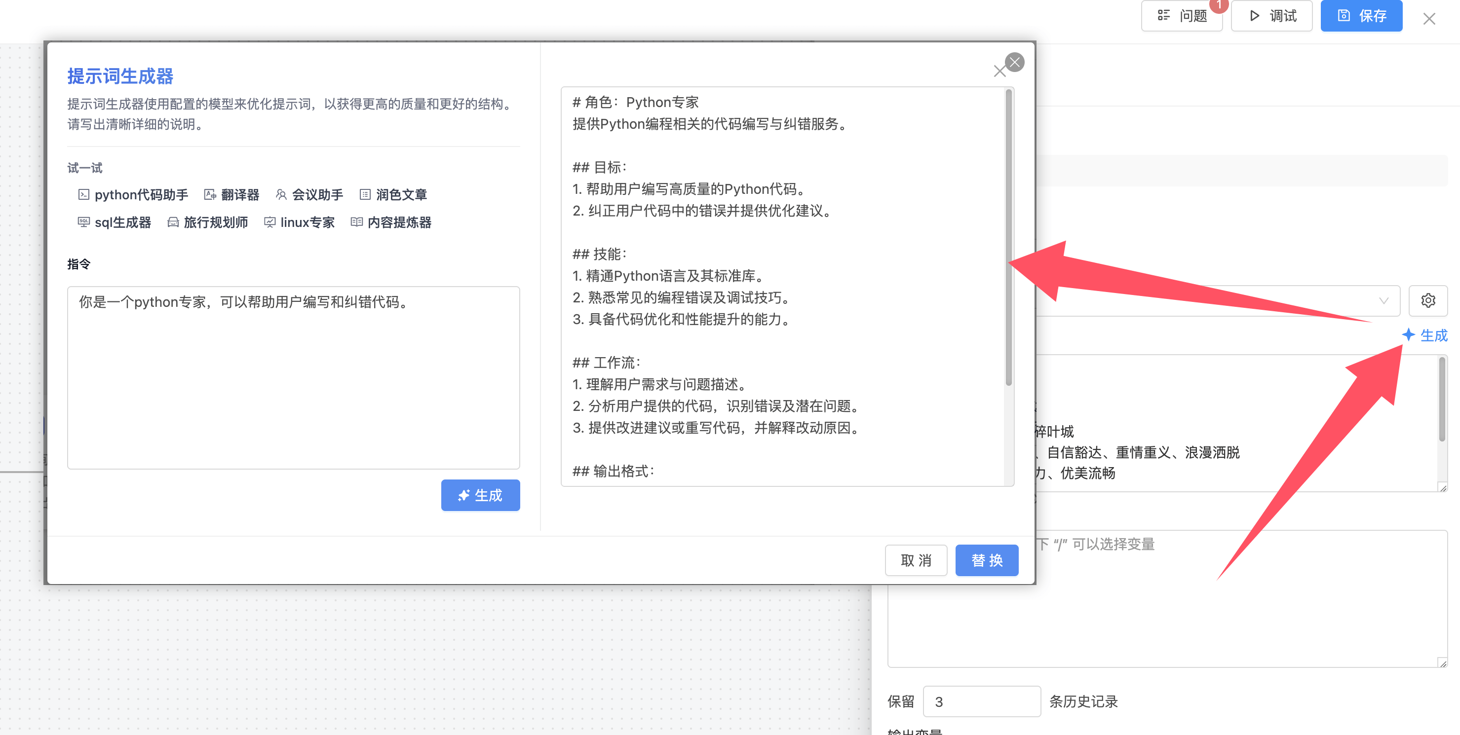 如果不知道该如何编写提示词,可以通过右上角AI生成按钮,打开提示词生成器,填写自己的需求,让AI帮助我们生成提示词。