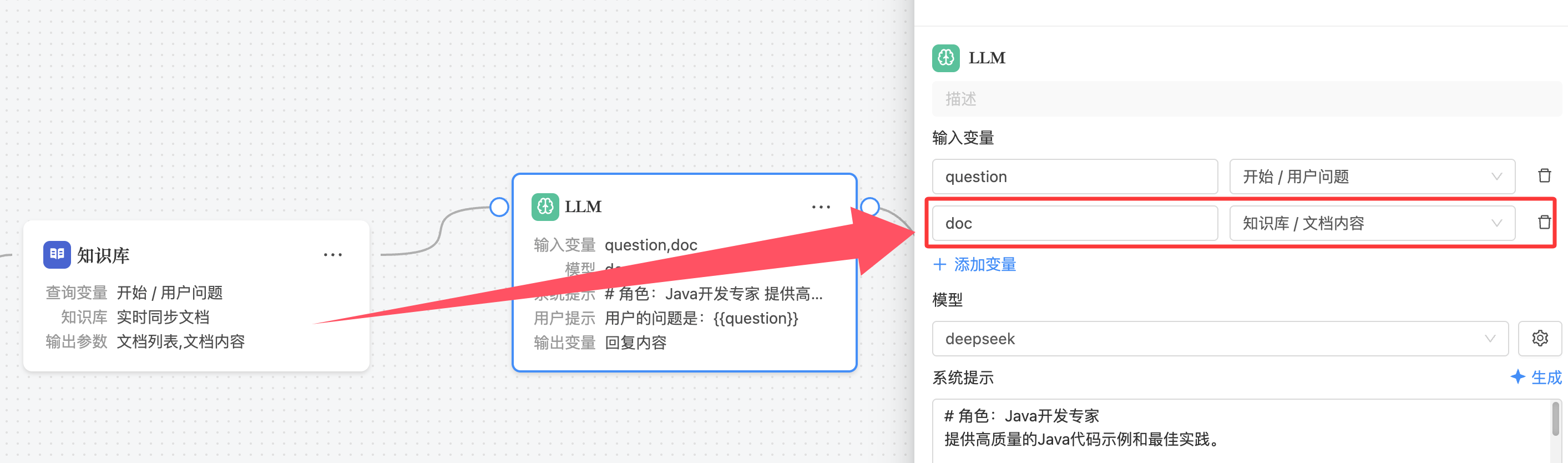 若定义的输入变量来自知识库节点 ,则 LLM 节点在调用模型时,会自动附加来自知识库的检索结果,从而具备 RAG(Retrieval-Augmented Generation,检索增强生成)能力。