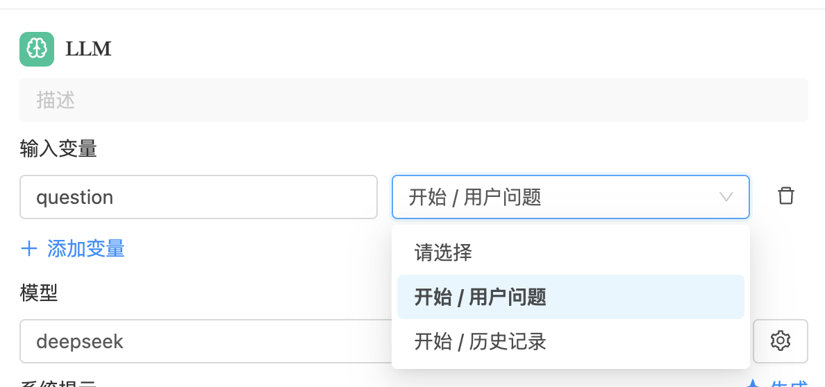 输入变量用于定义传递给 LLM 节点的参数来源。在节点右侧配置面板中,右侧下拉框选择变量来源节点,左侧输入框填写变量名称。