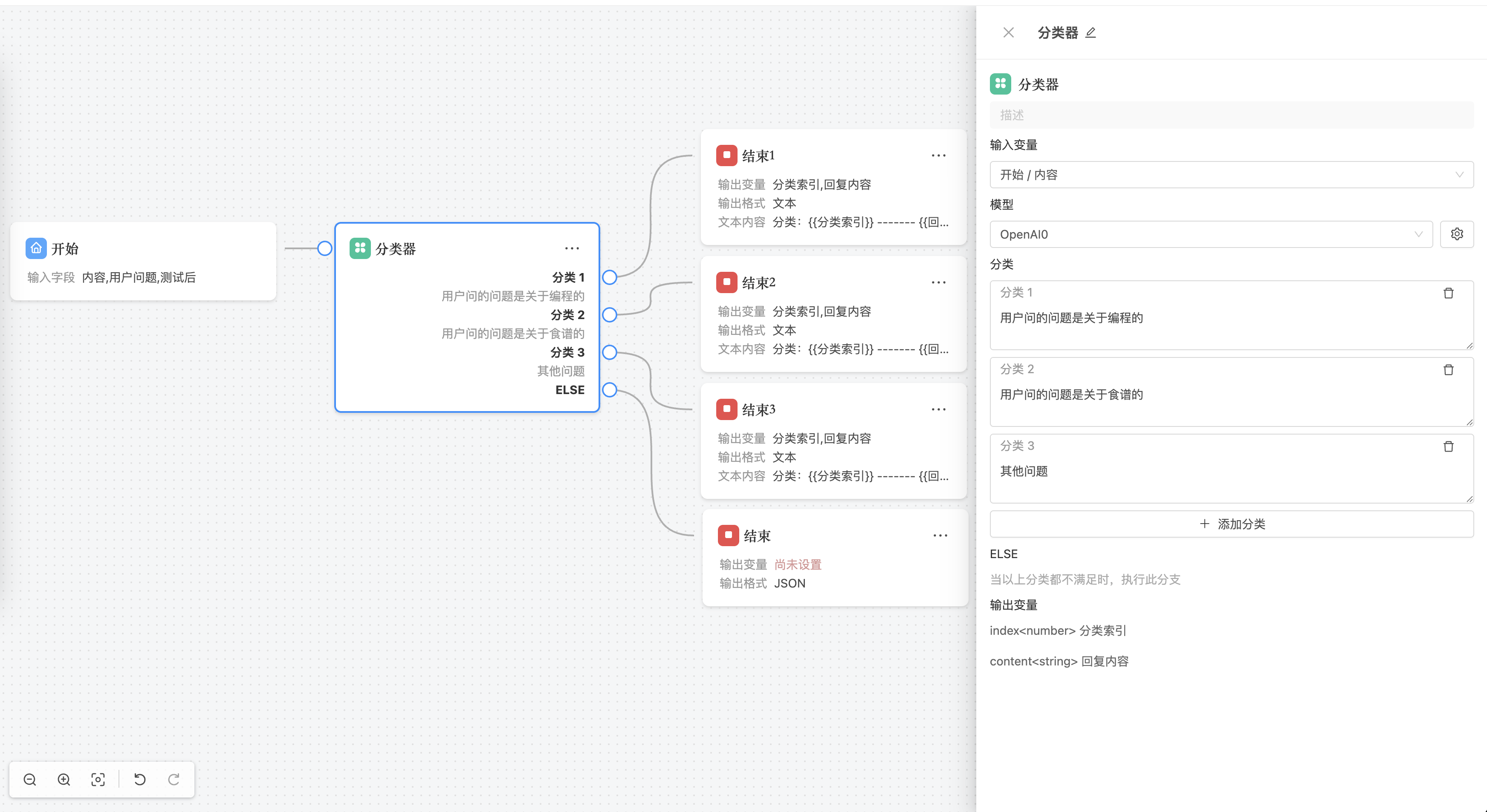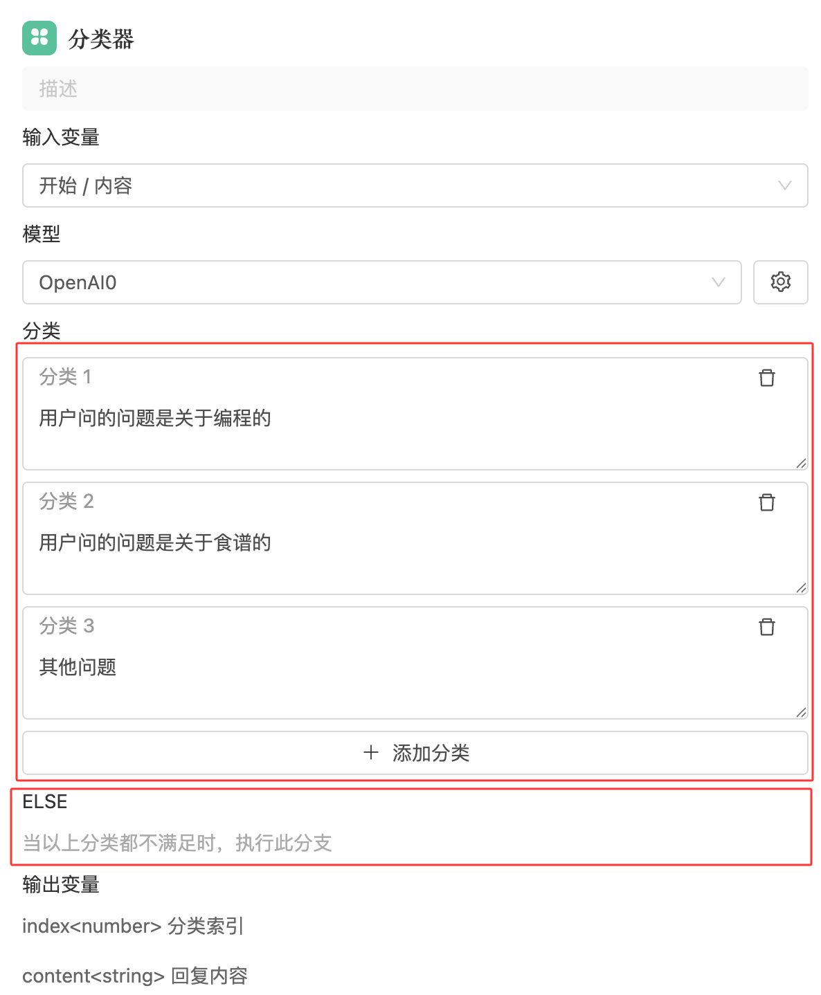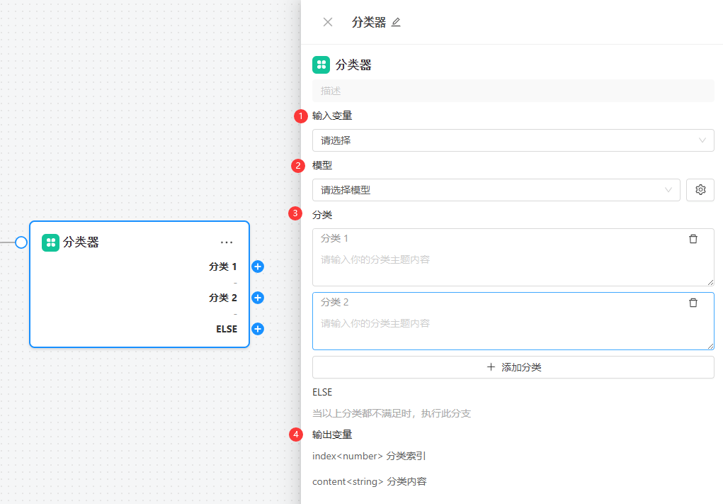 使用自然语言对每个分类进行描述,LLM 模型会基于输入内容进行语义分析,从而判断应归属于哪一类。分类器节点会根据模型输出的分类结果,将流程流转至相应的分支。