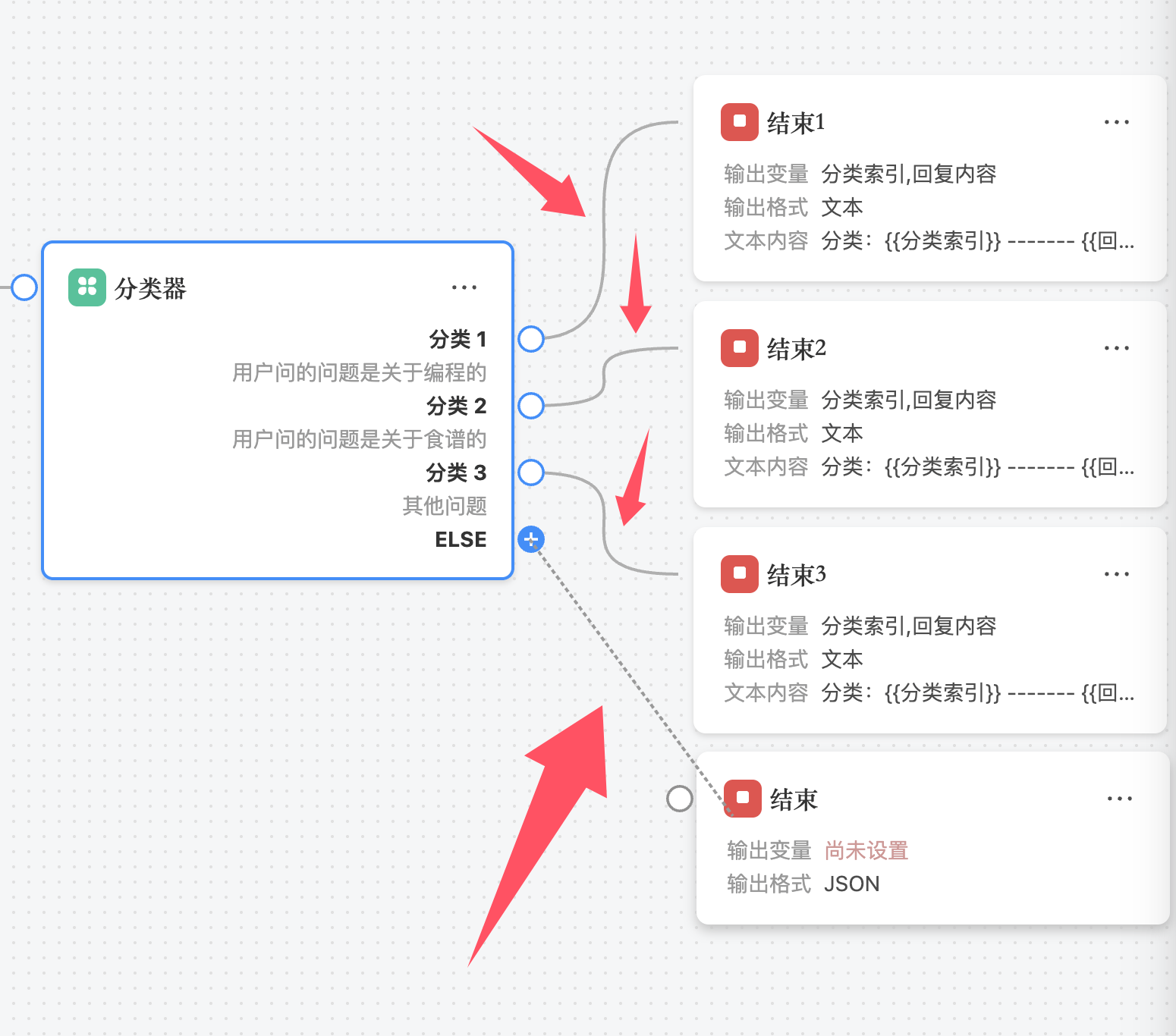 完成分类描述后,需要将每一个分类与工作流中的其他节点相连接,才能实现基于分类结果的自动分流。