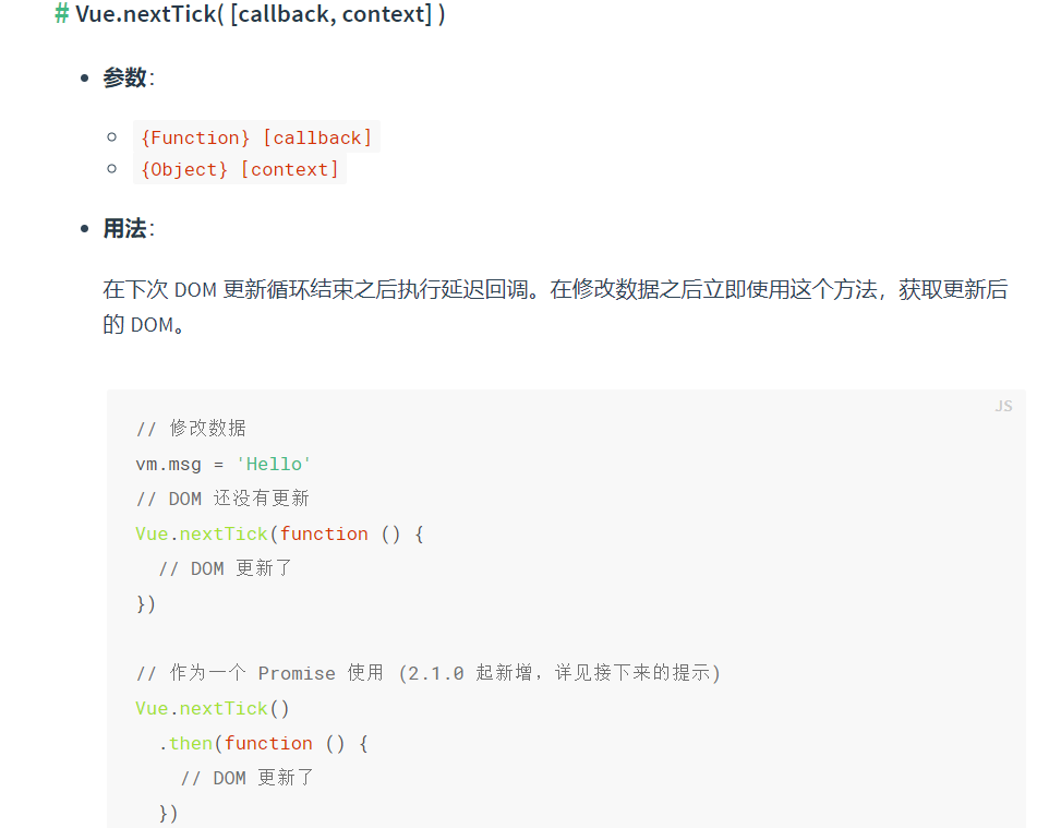 什么时候用:在改变数据后,要基于更新后的DOM进行某些操作时,要在nextTick所指定的回调函数中执行