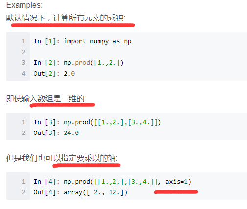 np.prod()函数用来计算所有元素的乘积,对于有多个维度的数组可以指定轴,如axis=1指定计算每一行的乘积。