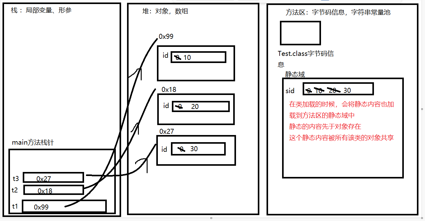 package com.demo4; /** * @Auther:liu * @Date:-14:24:35 * @Description:IntelliJ IDEA * @Version:1.0 */ public class Test { int id; static int sid; //这是一个main方法:是程序的入口 public static void main(String[] args) { Test t1 = new Test(); t1.id=10; t1.sid=10; Test t2 = new Test(); t2.id=20; t2.sid=20; Test t3 = new Test(); t3.id=30; t3.sid=30; System.out.println(t1.id); System.out.println(t2.id); System.out.println(t3.id); System.out.println(t1.sid); System.out.println(t2.sid); System.out.println(t3.sid); }