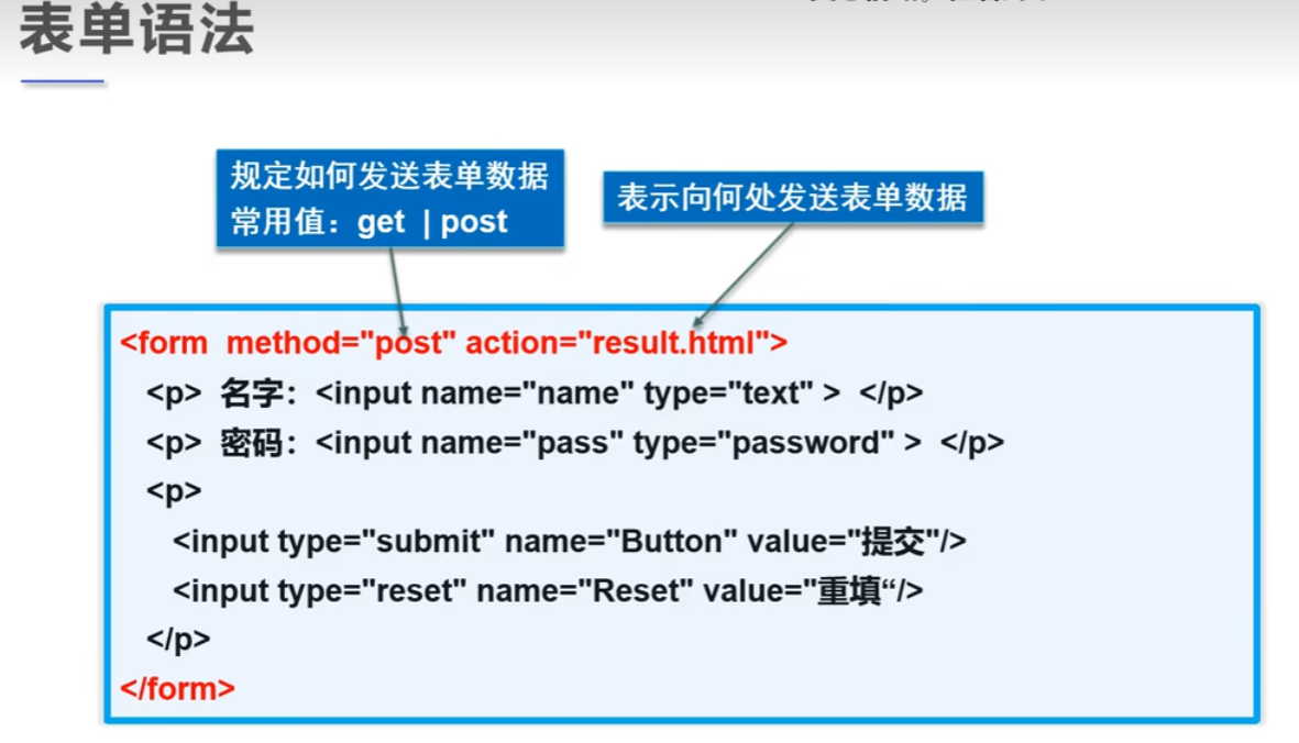 <!DOCTYPE html> <html lang="en"> <head> <meta charset="UTF-8"> <title>表单学习</title> </head> <body> <h1>注册</h1> <!--表单form action:表单提交的位置,可以是网站,也可以是一个请求处理地址 method:post ,get 提交方式 get方式提交我们可以在url中看到我们提交的信息,不安全,高效 post方式比较安全,传输大文件. --> <form action="html.html"method="post"> <!--文本输入框:input type="text--> <p>名字:<input type="text"name="username"></p> <p>密码:<input type="password"name="pwd"></p> <p><input type="submit"> <input type="reset"> </p> </form> </body> </html>