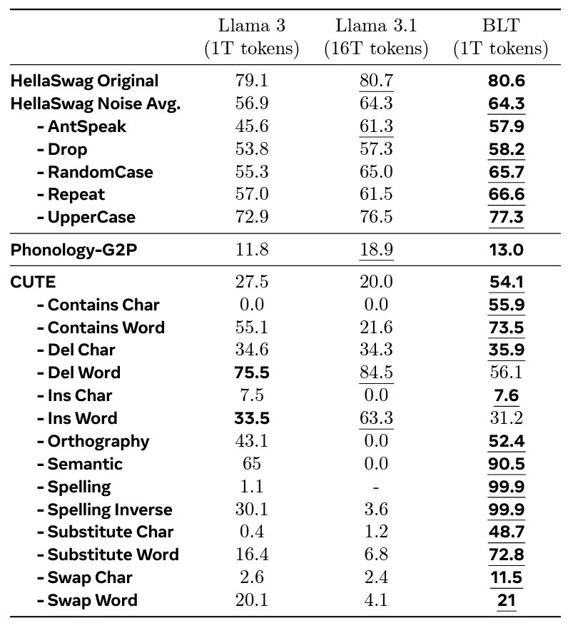 当Meta用与Llama 3相同的训练预算测试BLTs时,他们观察到性能非常相似,而BLT却表现出了大幅度减少的计算成本。令人印象深刻的是,BLT Llama的表现甚至超过了经过16倍更多训练数据的Llama 3.1。