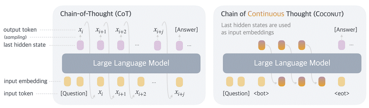简单来说,模型不再在完成处理后每次都生成一个新单词,而是将其最后一层的输出重新插入模型中以处理下一步,这意味着这些输出不再是语言,而成为“思维”。