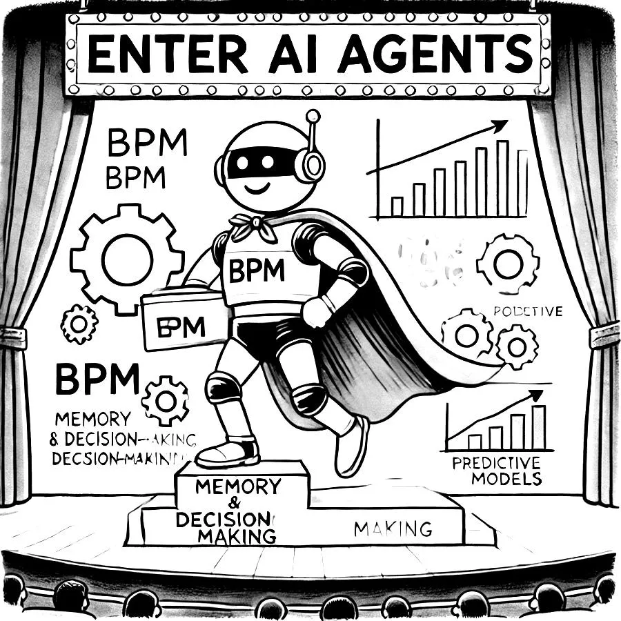 AI代理的出现:它们在BPM的基础上增加了记忆、链接和灵活的决策能力。它们可以回忆流程中的早期步骤,基于新数据动态调整,并协调多个AI模型以实时应对变化。