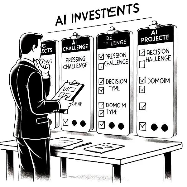 “有了这个分类,”我继续说道,“我们就能对每个潜在的 AI 投资进行评分或排序。它解决了一个紧迫的商业挑战吗?它属于哪种决策类型?我们处于哪个领域?这样,我们就不会胡乱将 AI 投放到无关的难题中。”